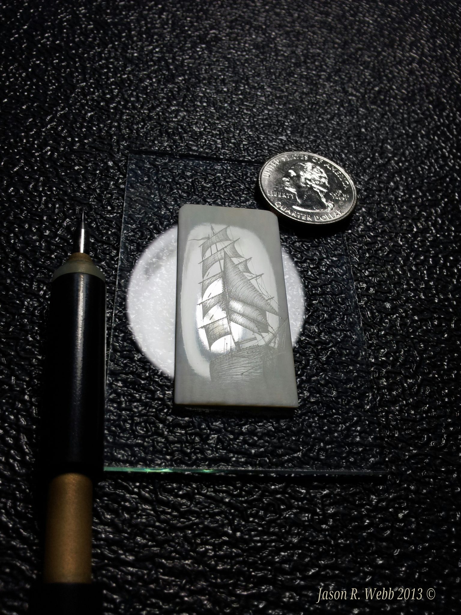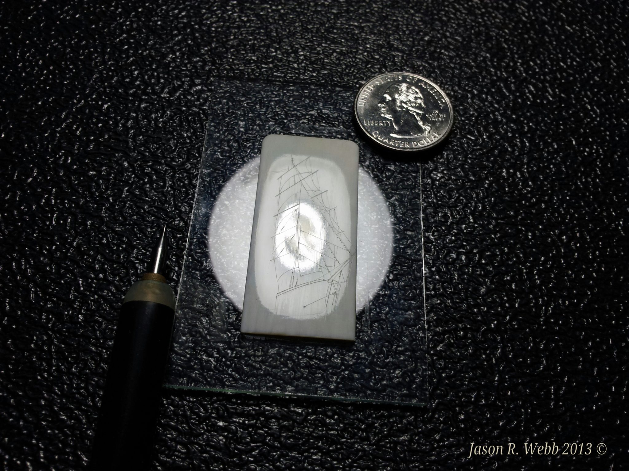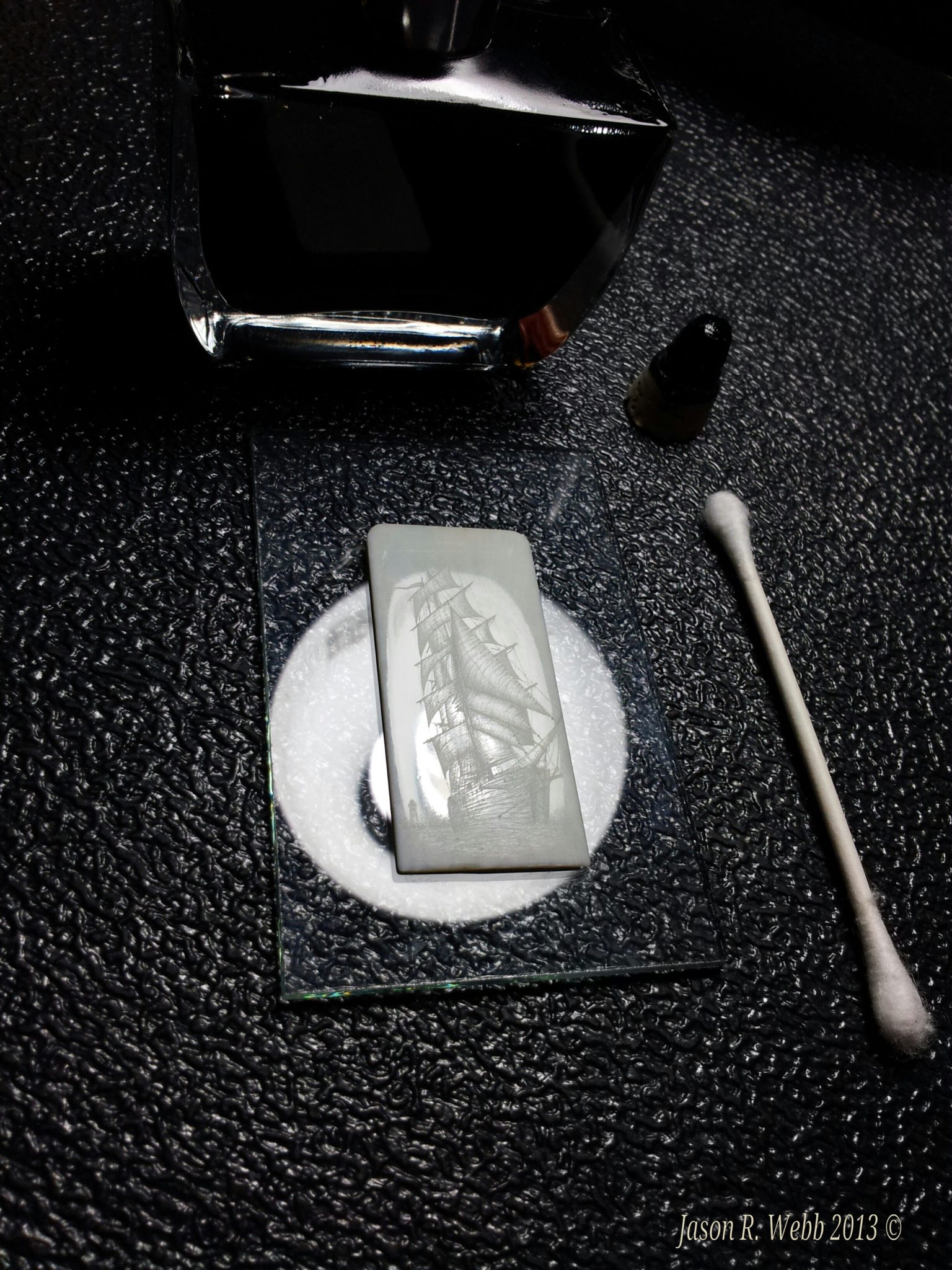 Notes: (from Scrimshaw.com) Many people (myself included) will scribe then ink, scribe, then ink. Jason’s ability to do most if not all of the work without repeatedly rubbing off the ink preserves a lot of his fine lines (see image # 7 and caption). Repeated rubbings will also make you lose the luster of the polish and some of the sealing. Too much pressure can also add cracks to the ivory. Using oil paint allows you to ink then scribe without losing the polish, but some people find it messy, and it takes a long time (up to several weeks depending on temperature and humidity) for it to dry, and if the ivory is not well sealed, the oil paint can in some instances cloud the surrounding ivory since the oil can wick beyond the lines.