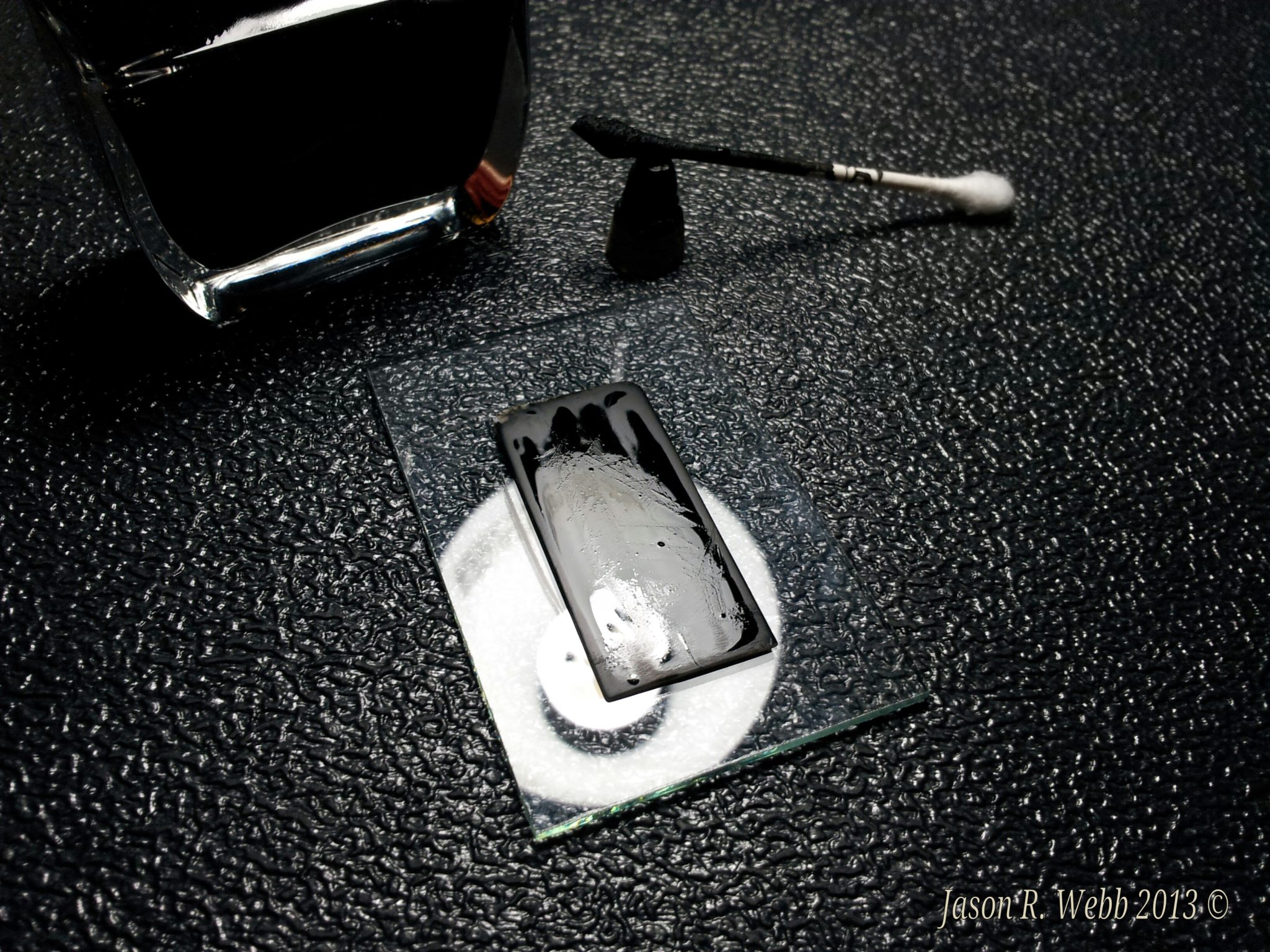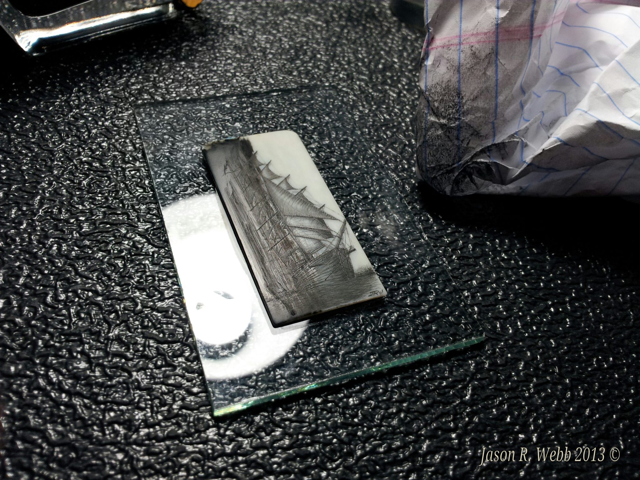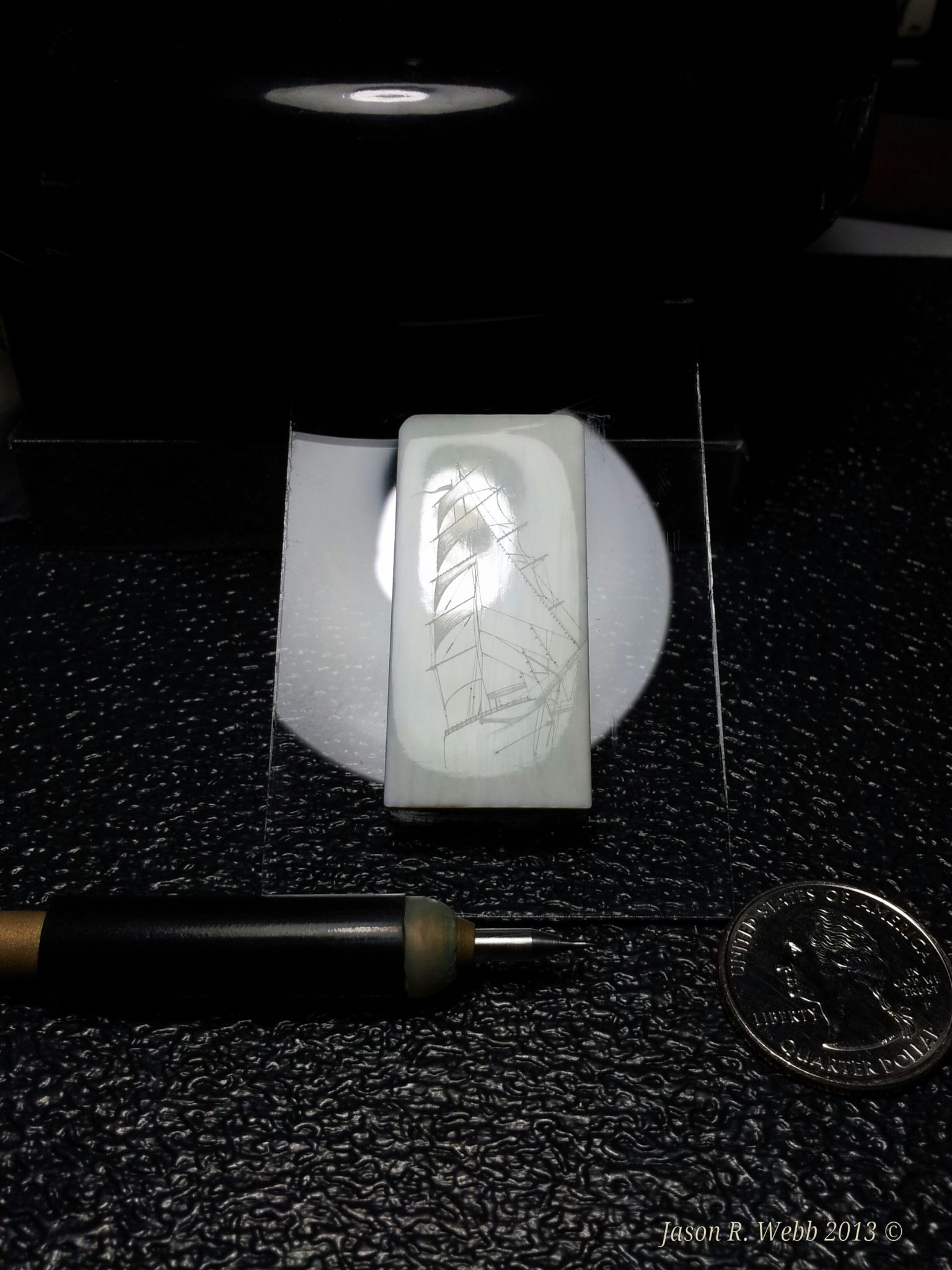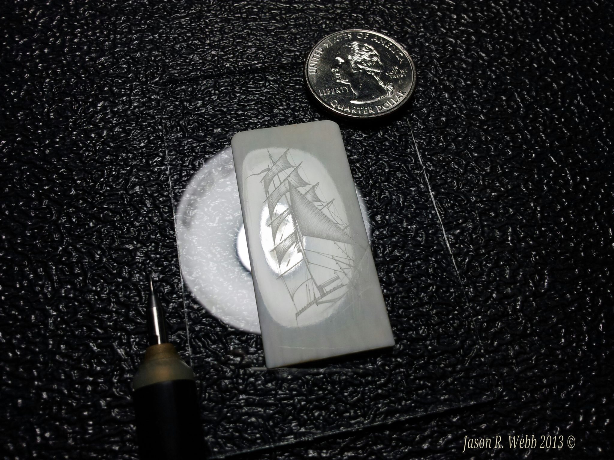 Notes: (from Scrimshaw.com) Many people (myself included) will scribe then ink, scribe, then ink. Jason’s ability to do most if not all of the work without repeatedly rubbing off the ink preserves a lot of his fine lines (see image # 7 and caption). Repeated rubbings will also make you lose the luster of the polish and some of the sealing. Too much pressure can also add cracks to the ivory. Using oil paint allows you to ink then scribe without losing the polish, but some people find it messy, and it takes a long time (up to several weeks depending on temperature and humidity) for it to dry, and if the ivory is not well sealed, the oil paint can in some instances cloud the surrounding ivory since the oil can wick beyond the lines.