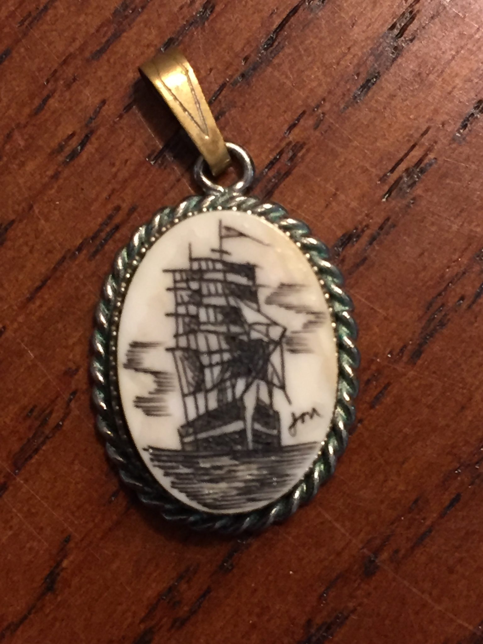 This mystery artist has the initials GAM which are on each of a series of five scrimshaws on a sterling silver bracelet. The work was more than likely done in the late 70’s to early 80’s. This particular item was done in full color, which I’ve not seen very often, and was well taken care of – the colors are still vivid. Most times they were done with black ink only.