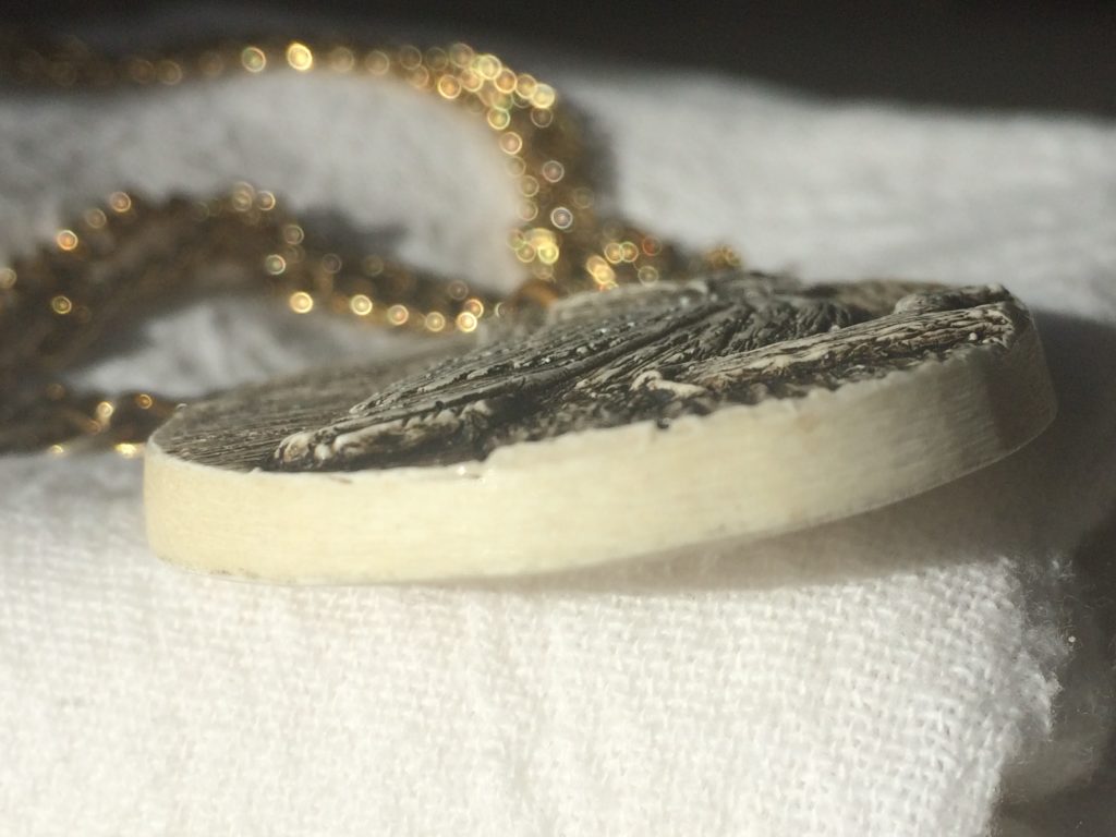 This is a fascinating piece. Both a carving and a sculpture, it’s beautiful work that has been well cared for. The base edge and the general shape makes it appear to be a sperm whale tooth.